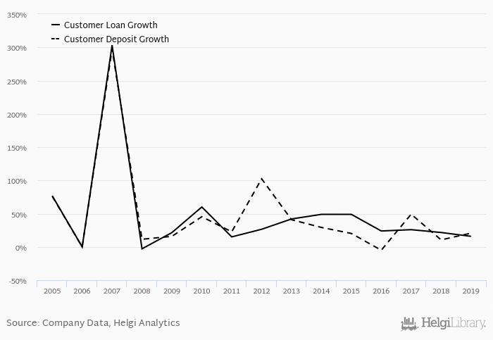 On the other hand, bank's customer deposit growth amounted to 20.6% at the end of 2019, up from 10.6% when compared to the previous year. Historically, the bank’s deposit growth reached an all time high of 298% in 2007 and an all time low of -4.98% in 2016. In the last decade, the average annual loan growth amounted to 31.0%.