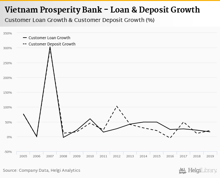 Vietnam Prosperity Bank's customer loan growth reached 15.9% in 2019, down from 21.7% compared to the previous year. Historically, the bank’s loans growth reached an all time high of 303% in 2007 and an all time low of -2.88% in 2008. In the last decade, the average annual loan growth amounted to 32.1%.