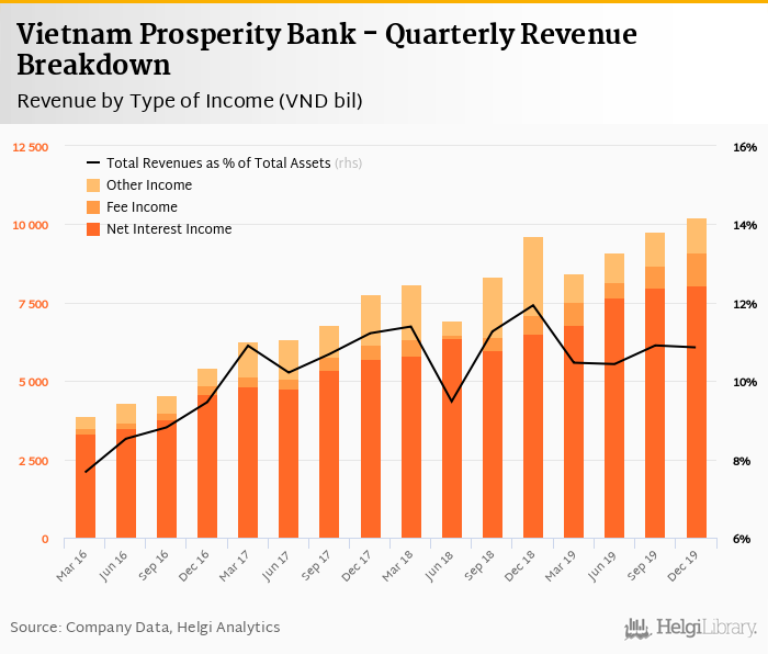 Vietnam Prosperity Bank generated total banking revenues of VND 10,239 bil in the fourth quarter of 2019, up 6.17% when compared to the same period of last year and 4.81% when compared to the previous quarter.