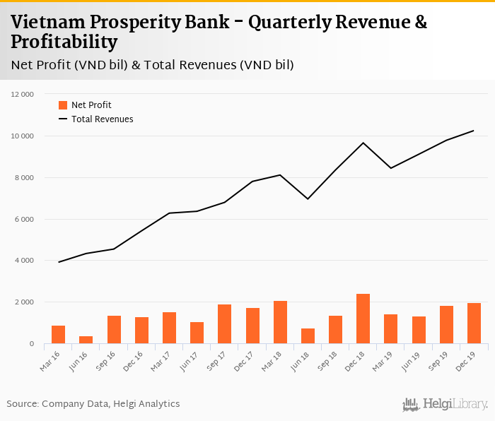Vietnam Prosperity Bank made a net profit of VND 1,982 bil under revenues of VND 10,239 bil in the fourth quarter of 2019, down 18.3% and up 6.17% respectively when compared to the same period last year.