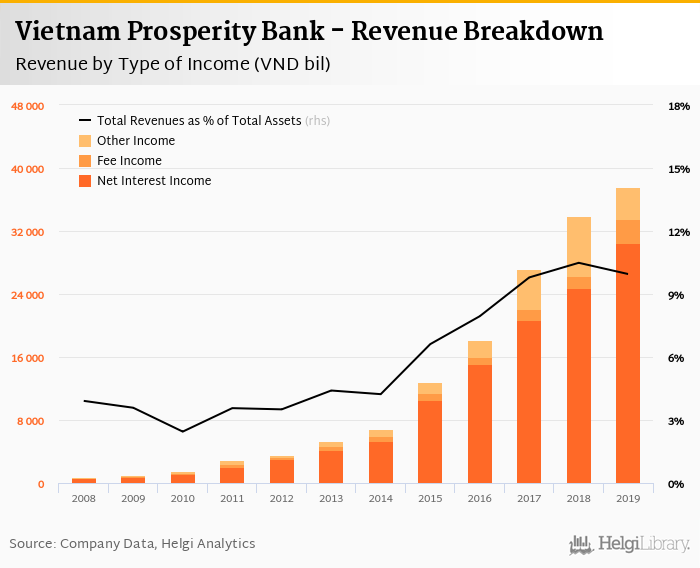 Vietnam Prosperity Bank generated total banking revenues of VND 37,530 bil in 2019, up 10.7% compared to the previous year.