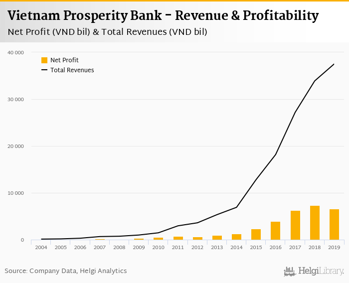 Vietnam Prosperity Bank made a net profit of VND 6,559 bil under revenues of VND 37,530 bil in 2019, up -10.1% and 10.7% respectively compared to the previous year.