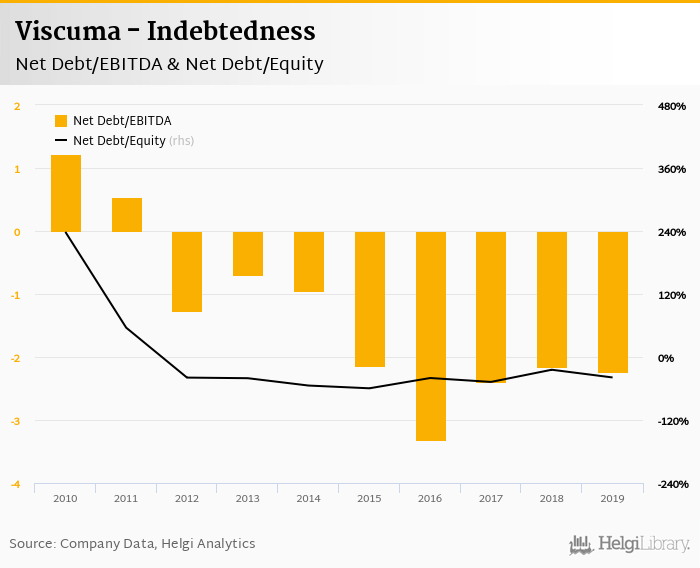 Viscuma's net debt stood at CZK -27.1 mil and accounted for -39.0% of equity at the end of 2019. The ratio is down 14.7 pp compared to the previous year.