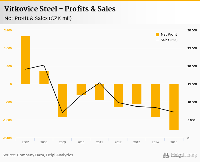 Vitkovice Steel made a net profit of CZK -2,043 mil in 2015, down 41.7% compared to the previous year. Total sales reached CZK 7,148 mil, which is down 15.2% when compared to the previous year.