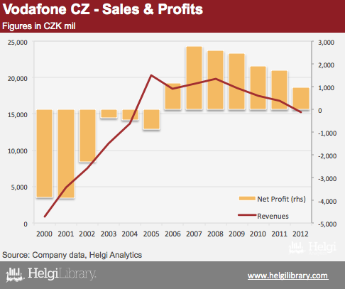 The mobile telephony has been a great business in the last decade. Since 2000 until 2008, Vodafone's total sales have increased 23-fold to around USD 1 bil in the Czech Republic. Since 2008 however, market saturation and increased competition has been pushing revenues and profits down.