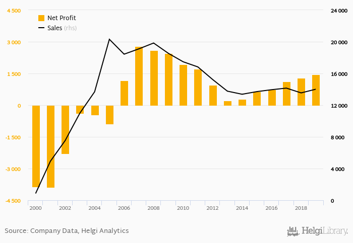 Sales have fallen by 2.76% a year on average since 2009. They reached a high of CZK 20,311 mil in 2005 and a low of CZK 854 mil in 2000.