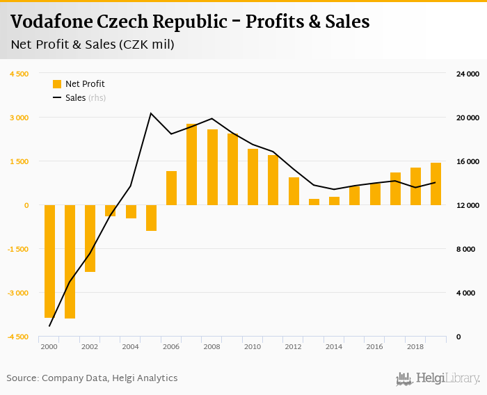 Vodafone Czech Republic made a net profit of CZK 1,457 mil in 2019, up 13.4% compared to the previous year. Total sales reached CZK 14,012 mil, which is up 3.44% when compared to the previous year.
