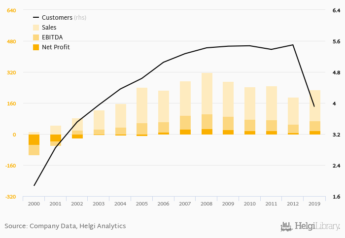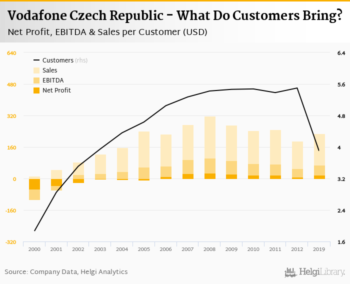 In 2019, Vodafone Czech Republic served a total of 3.90 mil customers, up 0% when compared to 3 years ago. A simple comparison of Vodafone Czech Republic's sales with a number of its customers reveals that the average customer brought the firm USD 159 revenue in 2019. In terms of profitability, a single client generated EBITDA of USD 51.5 and a net profit of USD 16.6 in 2019.
