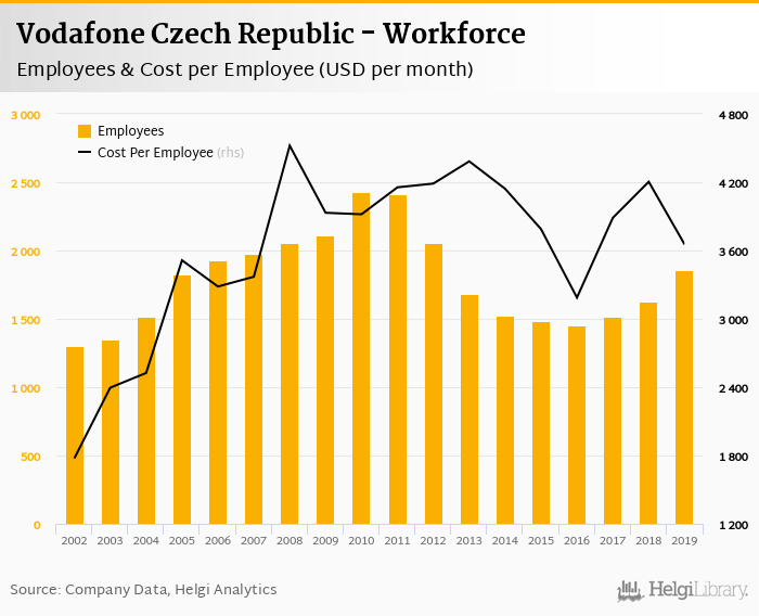 Vodafone Czech Republic employed 1,858 employees in 2019, up 14% compared to the previous year. Historically, between 2002 and 2019, the firm's workforce hit a high of 2,425 employees in 2010 and a low of 1,301 employees in 2002.