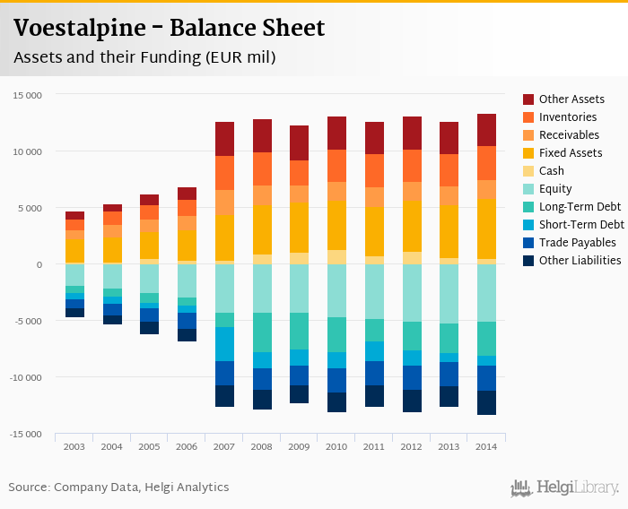 Voestalpine's total assets reached EUR 13,295 mil at the end of 2014, up 5.22% compared to the previous year.