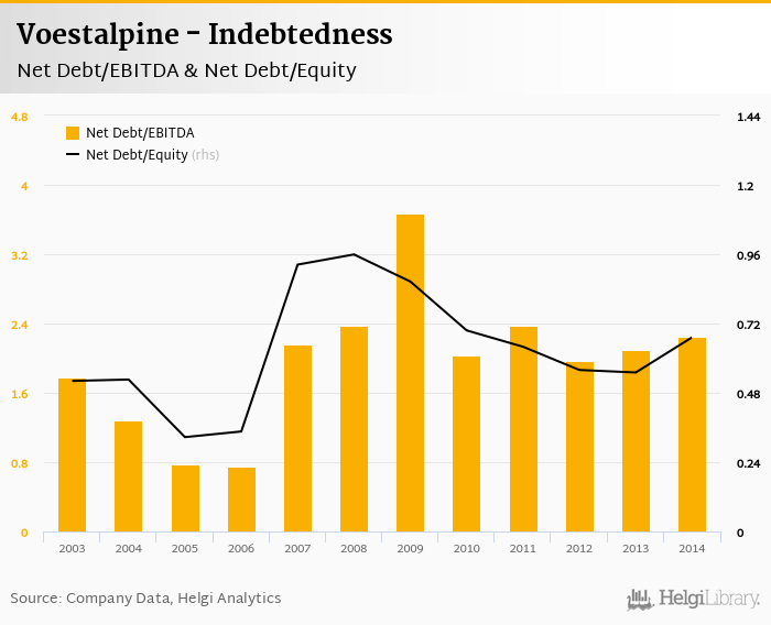 Voestalpine's net debt stood at EUR 3,430 mil and accounted for 0.672 of equity at the end of 2014. The ratio is up 0.122 pp compared to the previous year.