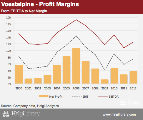 Voestalpine has overcame the financial crisis relatively well. Sales have reached the pre-crisis level of EUR 11.5 bil already in 2012, up 35% from its low in 2009. The operating profit reached EUR 854 mil in 2012 and was only 26% below the record level seen in the exceptional year 2007