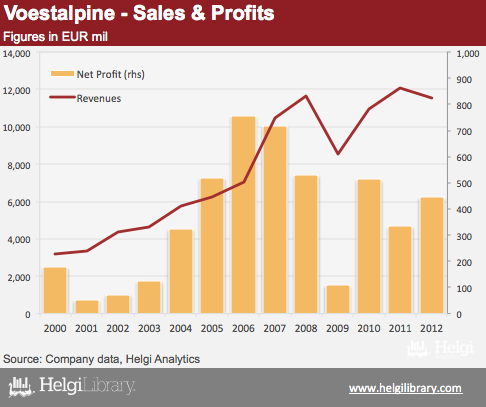Voestalpine has overcame the financial crisis relatively well. Sales have reached the pre-crisis level of EUR 11.5 bil already in 2012, up 35% from its low in 2009. The operating profit reached EUR 854 mil in 2012 and was only 26% below the record level seen in the exceptional year 2007