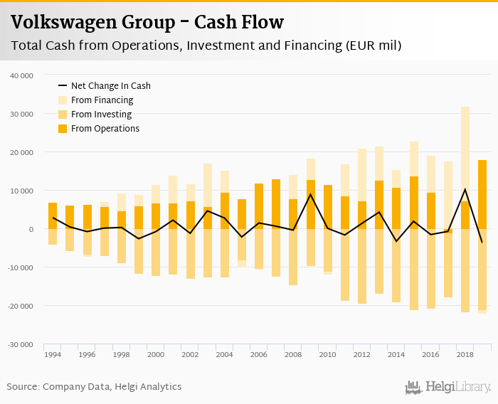 Volkswagen Group's operating cash flow stood at EUR 17,983 mil in 2019, up 147% when compared to the previous year. Historically, between 1994 - 2019, the firm’s operating cash flow reached a high of EUR 17,983 mil in 2019 and a low of EUR -1,186 mil in 2017.