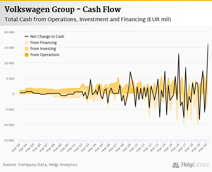 Volkswagen Group's operating cash flow stood at EUR 5,437 mil in 2Q2020, up 53.4% when compared to the previous year. Historically, between 1Q1990 - 2Q2020, the firm’s operating cash flow reached a high of EUR 6,364 mil in 3Q2019 and a low of EUR -3,177 mil in 2Q2017.
