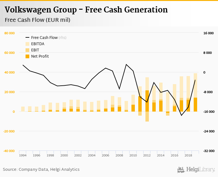 The company generated cash, defined by a sum of net profit and depreciation, of EUR 33,562 mil or 13.3% of sales. When investments are excluded, free cash flow reached EUR -3,163 mil, or -1.25% of sales in 2019.