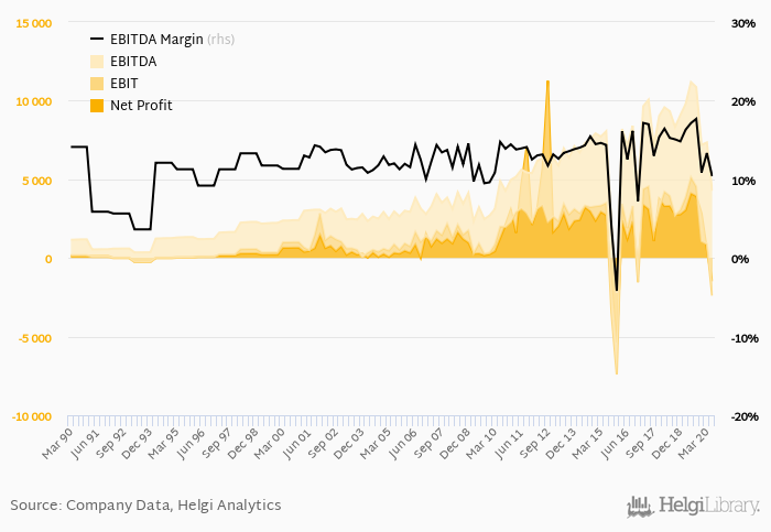 On the operating level, EBITDA reached EUR 4,272 mil, down 61.8% compared to the previous year. Over the last five years, company's EBITDA has fallen 11.9% a year on average.