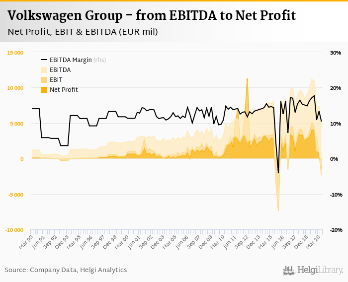 Volkswagen Group made a net profit of EUR -1,485 mil with revenues of EUR 41,076 mil in 2Q2020, down by 384% and down by 25.4%, respectively, compared to the previous year. This translates into a net margin of -3.62%.