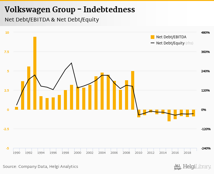 Volkswagen Group's net debt stood at EUR -33,540 mil and accounted for -27.1% of equity at the end of 2019. The ratio is up 2.19 pp compared to the previous year.