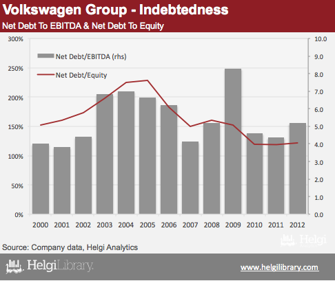 Company's net debt peaked at 229% of equity in 2005. In spite of all the acquisitions and investments in the last decade, Volkswagen Group's indebtedness dropped to 121% at the end of 2012