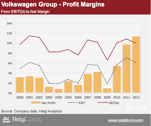 Profit margins of Volkswagen Group has been steadily rising in the last decade. While EBITDA margin increased only slightly, the EBIT and net margin showed a massive improvement in the last years (being 43% and 126% higher in the last three years compared to the average in the last decade). While net profit is heavily affected by financial operations, the improving operating performance is really encouraging