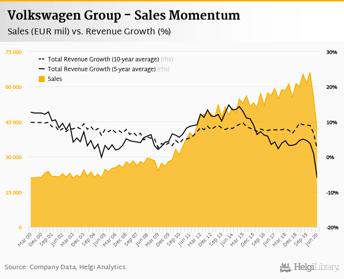 Volkswagen Group generated sales of EUR 41,076 mil in 2Q2020, down 37% compared to the previous year. Historically, between 1Q1990 and 2Q2020, the company’s sales reached a high of EUR 66,017 mil in 4Q2019 and a low of EUR 8,173 mil in 1Q1990.