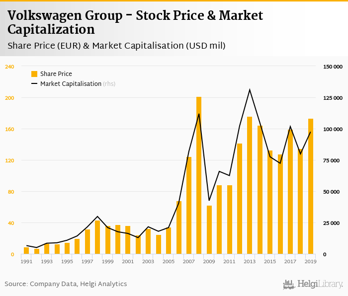 Historically, between 1991 and 2019, the Volkswagen Group’s stock price reached a high of EUR 201 in 2008 and a low of EUR 7.28 in 1992.