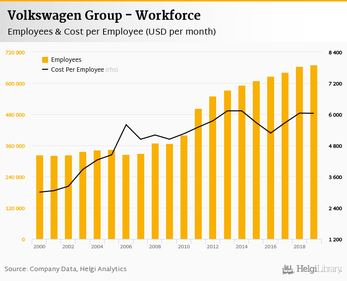 Volkswagen Group employed 671,205 employees in 2019, up 1.01% compared to the previous year. Historically, between 1990 and 2019, the firm's workforce hit a high of 671,205 employees in 2019 and a low of 243,638 employees in 1994.
