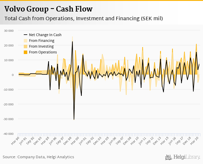 Volvo Group's operating cash flow stood at SEK -1,987 mil in 2Q2020, down 118% when compared to the previous year. Historically, between 1Q1990 - 2Q2020, the firm’s operating cash flow reached a high of SEK 20,706 mil in 4Q2019 and a low of SEK -22,300 mil in 2Q1999.