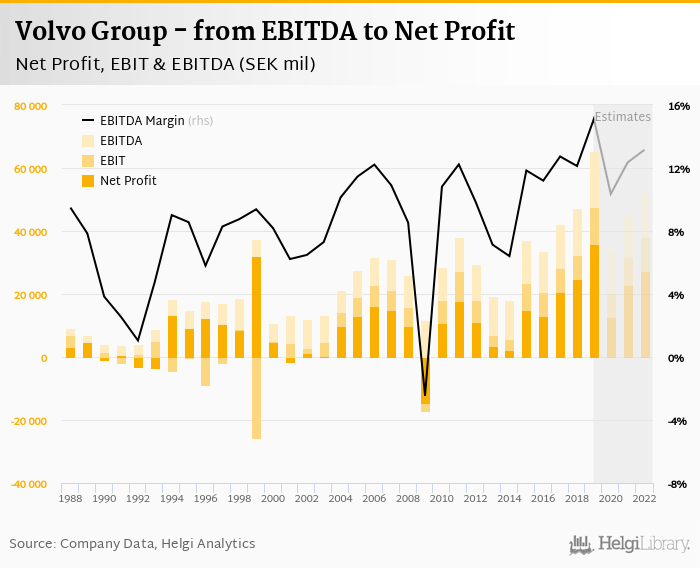 Volvo Group made a net profit of SEK 35,861 mil with revenues of 431,980 in 2019, up by 44% and up by 10.5%, respectively, compared to the previous year. This translates into a net margin of 8.30%.