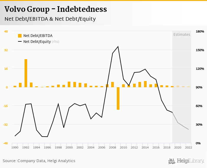 Volvo Group's net debt stood at SEK 69,567 mil and accounted for 49.1% of equity at the end of 2019. The ratio is down 3.66 pp compared to the previous year.