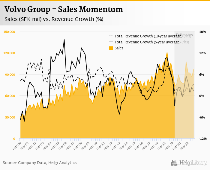 Volvo Group generated sales of SEK 73,227 mil in 2Q2020, down 39.3% compared to the previous year. Historically, between 1Q1990 and 2Q2020, the company’s sales reached a high of SEK 120,694 mil in 2Q2019 and a low of SEK 19,041 mil in 1Q1991.