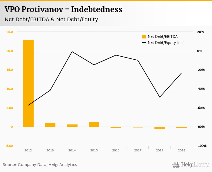 VPO Protivanov's net debt stood at CZK -4.53 mil and accounted for -23.2% of equity at the end of 2019. The ratio is up 25.6 pp compared to the previous year.