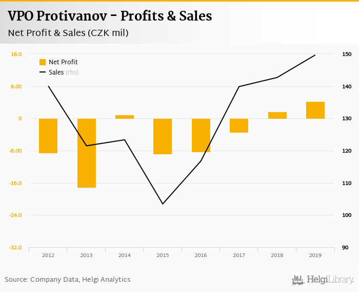 VPO Protivanov made a net profit of CZK 4.27 mil in 2019, up 150% compared to the previous year. Total sales reached CZK 150 mil, which is up 4.9% when compared to the previous year.