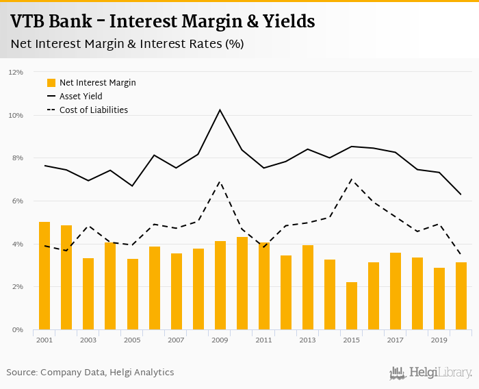 VTB Bank's net interest margin amounted to 3.16% in 2020, up from 2.91% compared to the previous year.