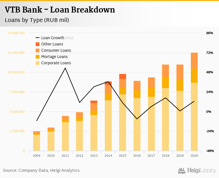 At the end of 2020, VTB Bank's loans accounted for 90.7% of total deposits and 64.1% of total assets.