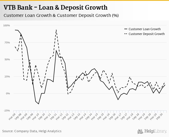 VTB Bank's customer loan growth reached 12.6% in 2020-12-31, up from 0.622% compared to the previous year. Historically, the bank’s loans growth reached an all time high of 93.1% in 2008-03-31 and an all time low of -15.4% in 2010-03-31. In the last decade, the average annual loan growth amounted to 15.6%.