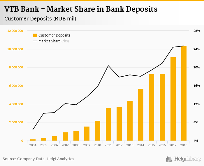 VTB Bank accounted for 24.7% of all customer deposits taken by banks in Russia at the end of 2018. Historically, the bank’s market share in customer deposits reached an all time high of 24.7% in 2018 and an all time low of 6.37% in 2004.