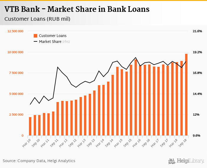 VTB Bank accounted for 18.1% of all customer loans issued in Russia at the end of 2018-09-30. Historically, the bank’s market share in customer loans reached an all time high of 18.6% in 2015-12-31 and an all time low of 13.2% in 2010-03-31.