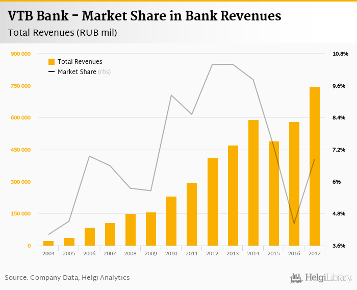 As a result, VTB Bank accounted for 6.85% of all bank revenues generated by banks in Russia in 2017. Historically, the bank’s market share in total revenues reached an all time high of 10.4% in 2013 and an all time low of 4.01% in 2004.