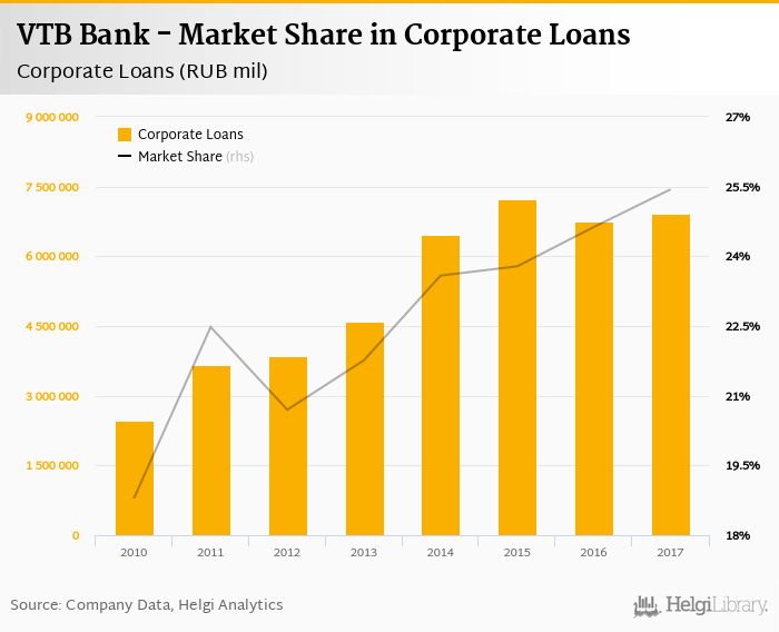 VTB Bank accounted for 25.4% of all corporate loans issued in Russia at the end of 2017. Historically, the bank’s market share in corporate loans reached an all time high of 25.4% in 2017 and an all time low of 18.8% in 2010.