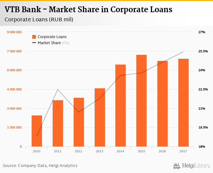 VTB Bank accounted for 25.4% of all corporate loans issued in Russia at the end of 2017. Historically, the bank’s market share in corporate loans reached an all time high of 25.4% in 2017 and an all time low of 18.8% in 2010.