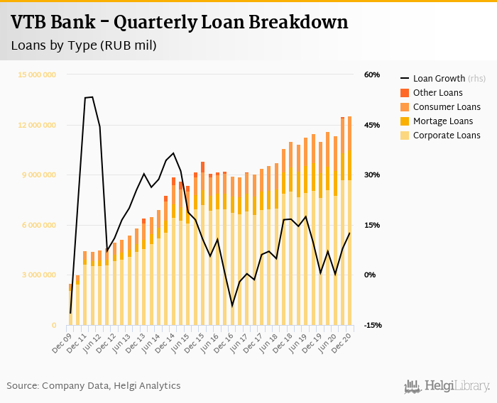 Mortgage loans represented 14.2% of the bank's loan book at the end of the year 4Q2020, consumer further 16.4% and corporate loans 69.4% of total loans.