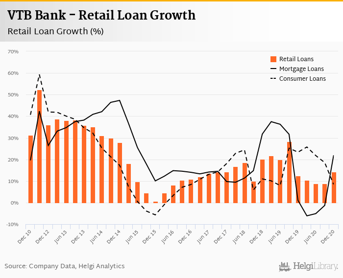 Mortgage loans rose 9.11% to RUB 1,776,000 mil in 2020-12-31 and accounted for 46.4% of the retail loan portfolio.