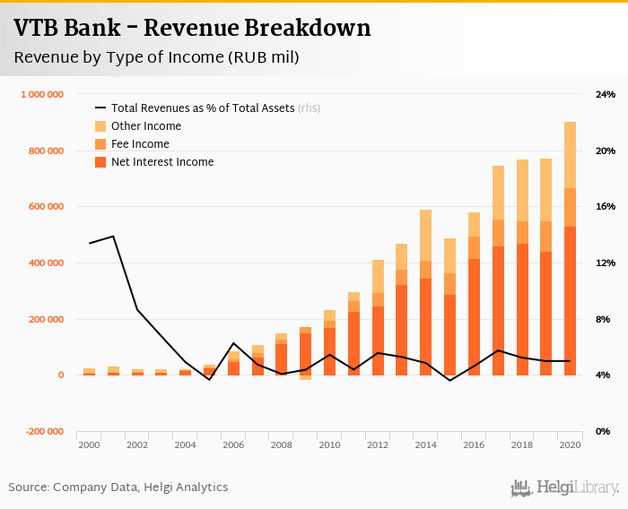 Historically, the bank’s revenues containing of interest, fee and other non-interest income reached an all time high of RUB 905,500 mil in 2020 and an all time low of RUB 22,180 mil in 2003. The average revenue in the last five years amounted to RUB 755,660 mil.