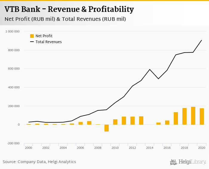 VTB Bank made a net profit of RUB 177,160 mil under revenues of RUB 905,500 mil in 2020, up -7.69% and 17.1% respectively compared to the previous year.