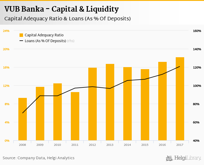 Comparing VUB Banka with its closest peers, Slovenska Sporitelna ended the year 2017 with a capital adequacy ratio at 18.7% and loans to deposits of 93.9% and Tatra banka with 18.7% and 93.0% respectively.
