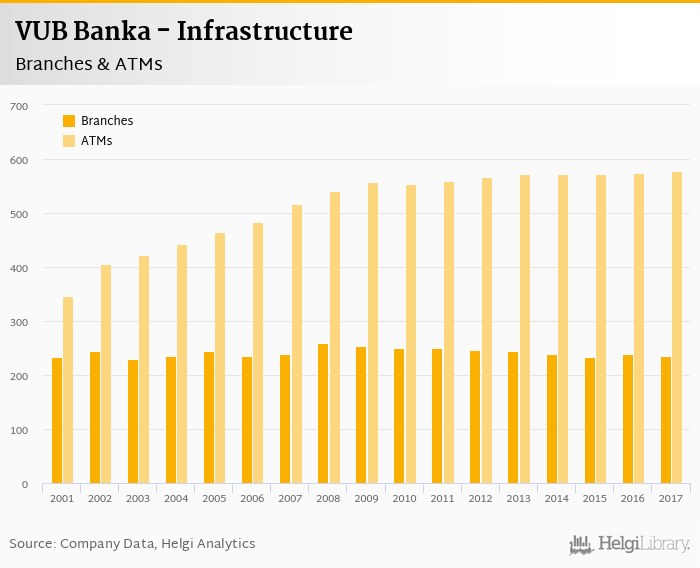 Comparing VUB Banka with its closest peers, Prima Banka Slovakia operated a network of 127 branches and 282 ATMs in 2017, Slovenska Sporitelna had 271 branches and 805 ATMs and Tatra banka had a network of 187 branches with 313 ATMs in 2017.
