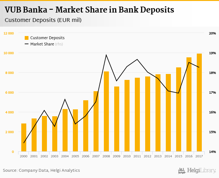 VUB Banka accounted for 18.3% of all customer deposits taken by banks in Slovakia at the end of 2017. Historically, the bank’s market share in customer deposits reached an all time high of 18.9% in 2008 and an all time low of 14.4% in 2000.