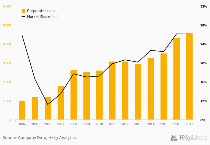 VUB Banka accounted for 26.1% of all corporate loans issued in Slovakia at the end of 2017. Historically, the bank’s market share in corporate loans reached an all time high of 26.1% in 2016 and an all time low of 11.2% in 2006.